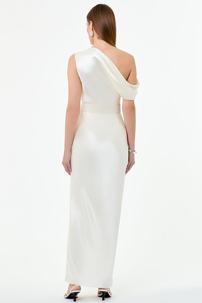Features an asymmetrical neckline and a side split for movement
