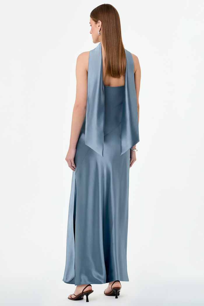 Features a cowl neckline, side splits and a matching neck sash to complete the look