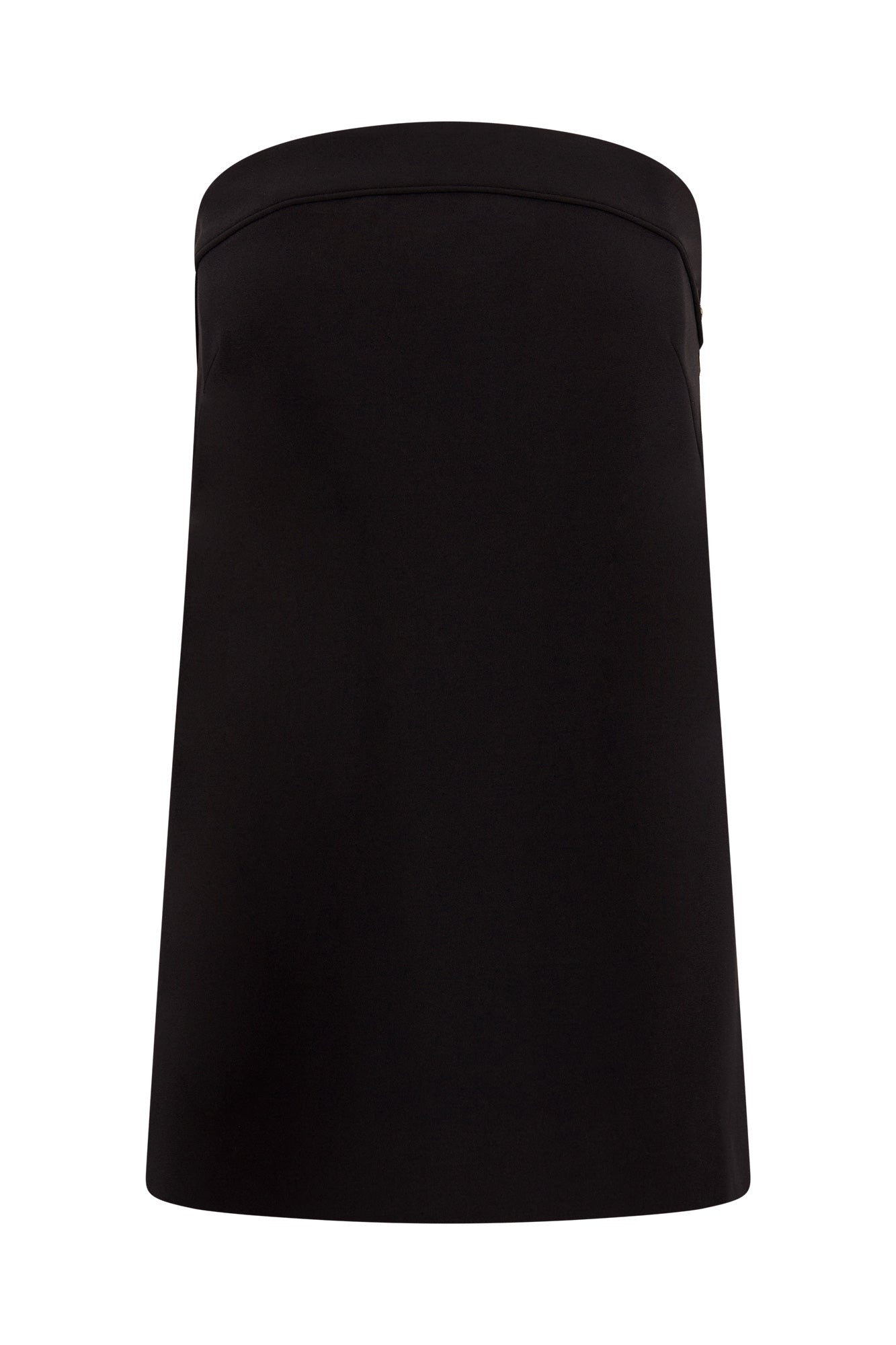 Fitted shelf bra inside, open metal zipper closure at side with side slit.