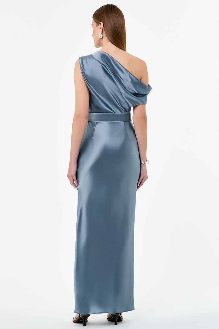 Features an asymmetrical neckline and a side split for movement