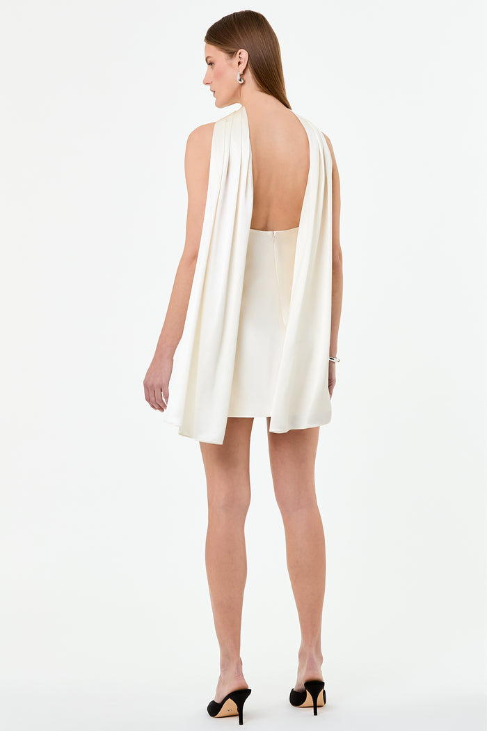 A halter mini dress featuring a long sash detail for added movement