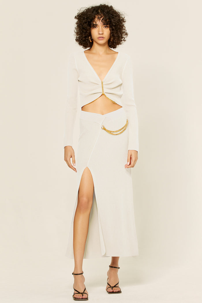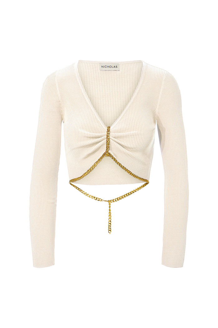Part of any well-curated wardrobe, knitwear pieces are put on the style spotlight in our capsule collection. The Alma top combines both relaxed and elegant vibes thanks to its ribbed profile and long sleeves, while the detachable gold-chain accents and ruched detail creates a compelling mix. A versatile top that can be worn with or without the chain and on different occasions.