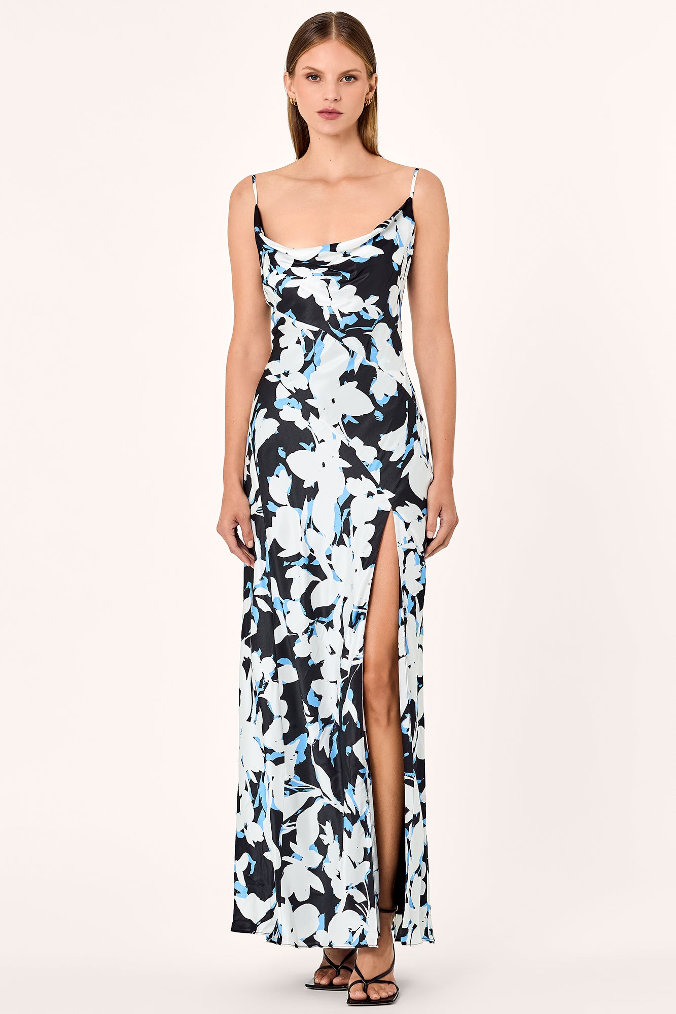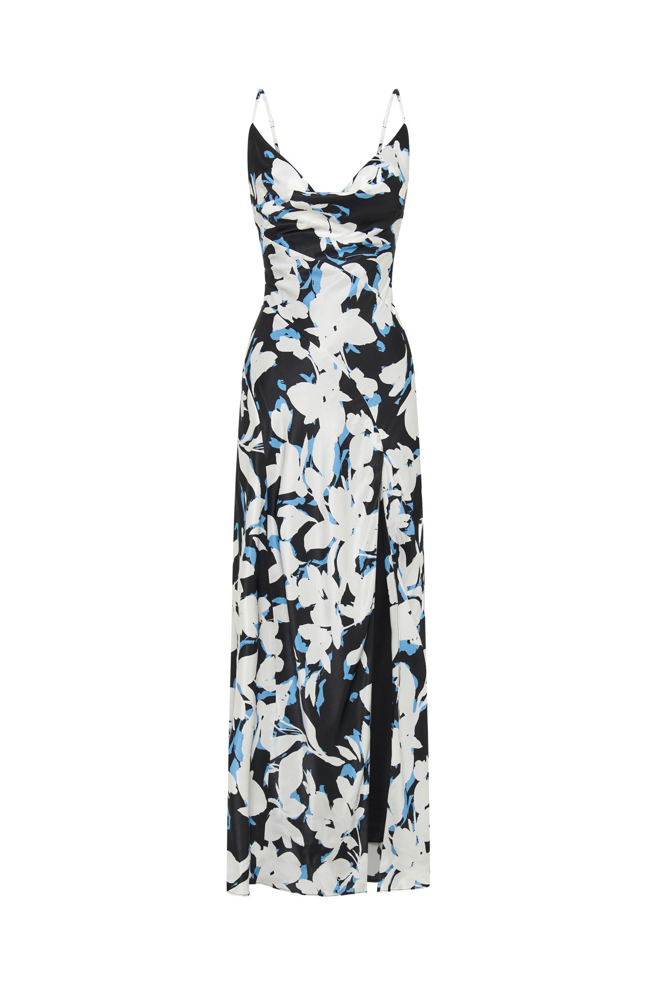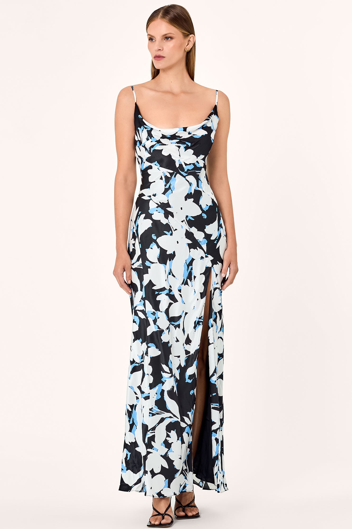 Asymmetrical cowl gown with thigh-high slit.