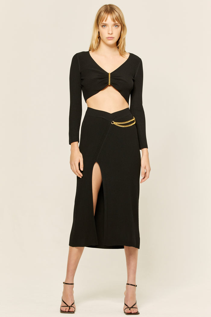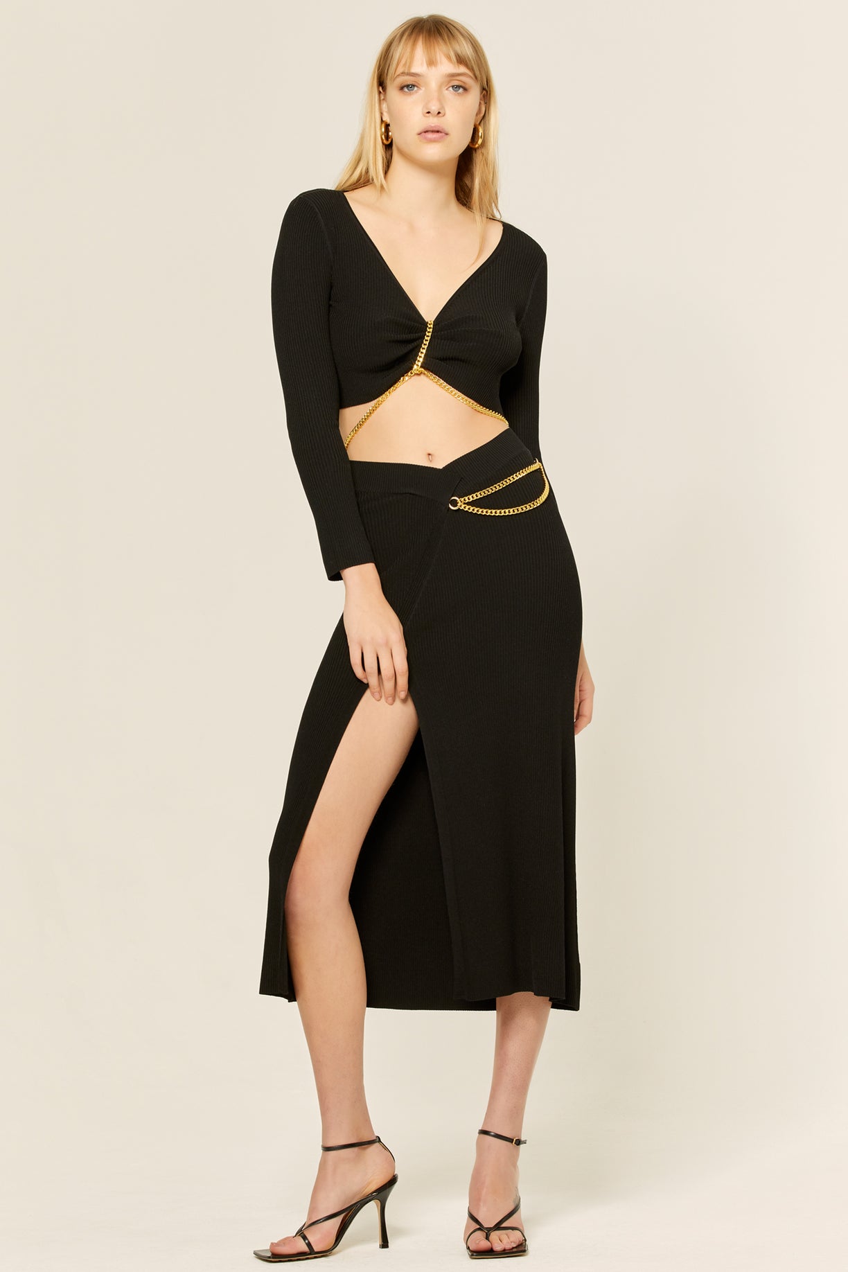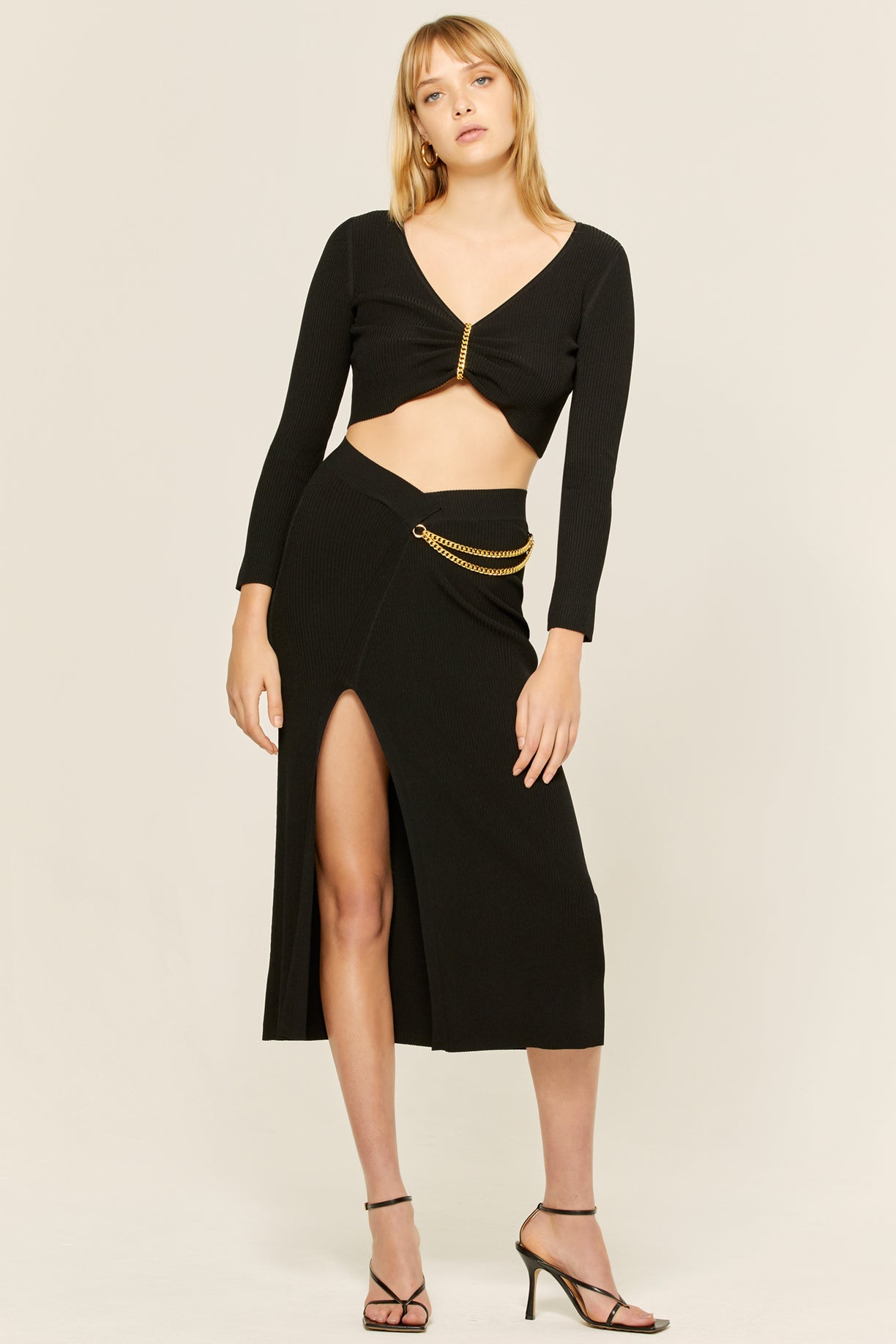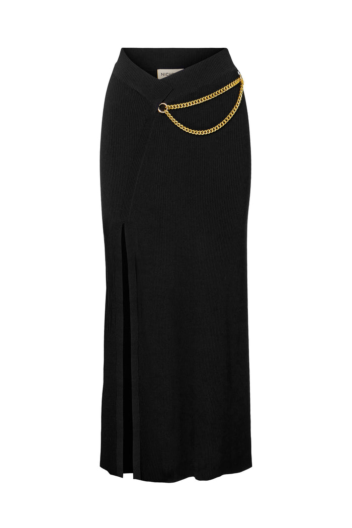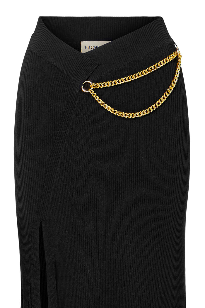 Make effortless work of sophisticated dressing with our Gisele skirt. A key design in our new capsule collection, this figure-skimming skirt is made from a knitted jersey with a ribbed profile. Perfect to pair with our Paloma or Alma tops, it has an asymmetric high-waist, detailed by a removable gold-tone curb chain and a side slit falling to a mid-length.