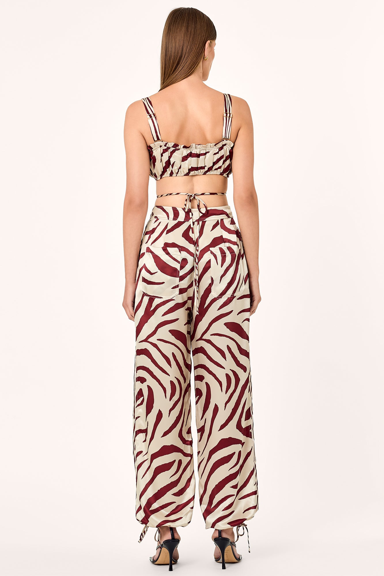 Wide-leg pants with tie at leg opening.