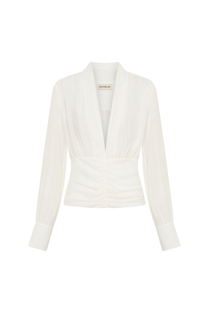 Featuring a flattering deep plunge neckline, ruched detailiing, and a fitted waist