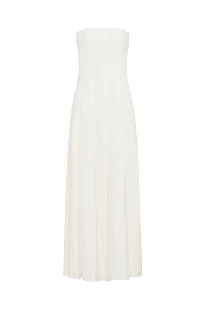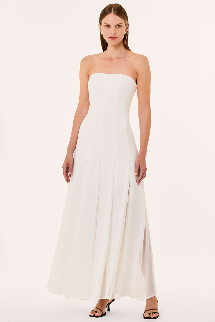 A classic, flattering strapless dress featuring a sheer panelled godet skirt