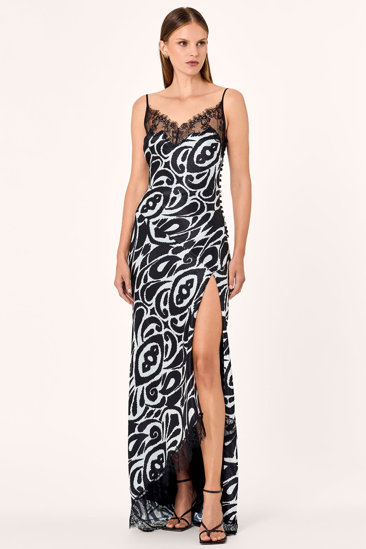 Lace trim at neckline and along the hem.