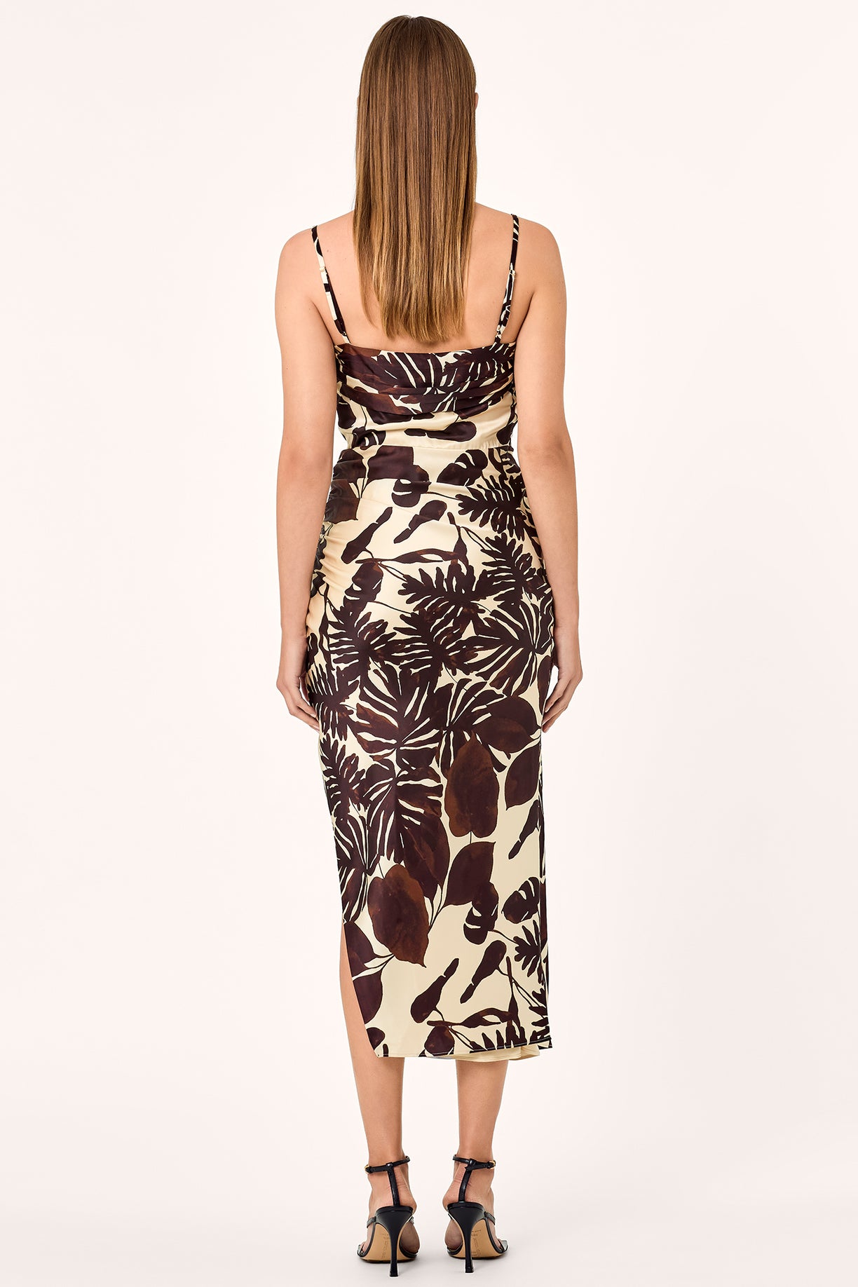 Asymmetrical front neck with thigh-high slit.Dry clean only.