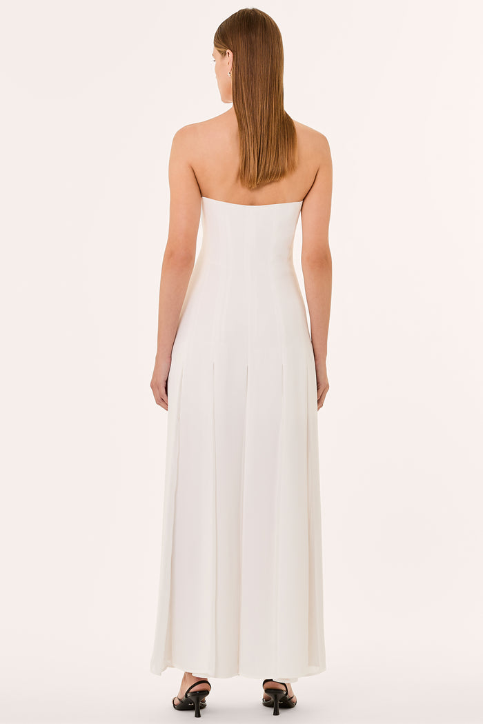 A classic, flattering strapless dress featuring a sheer panelled godet skirt