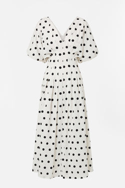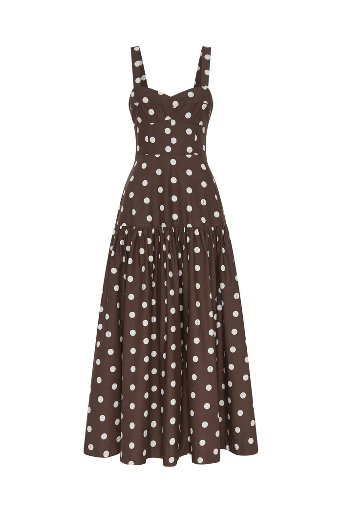 A chocolate brown mid length dress adorned with classic ivory polka dots. Designed with a flattering sweetheart neckline and wide shoulder straps, it features a fitted bodice that falls into a softly gathered tiered skirt.