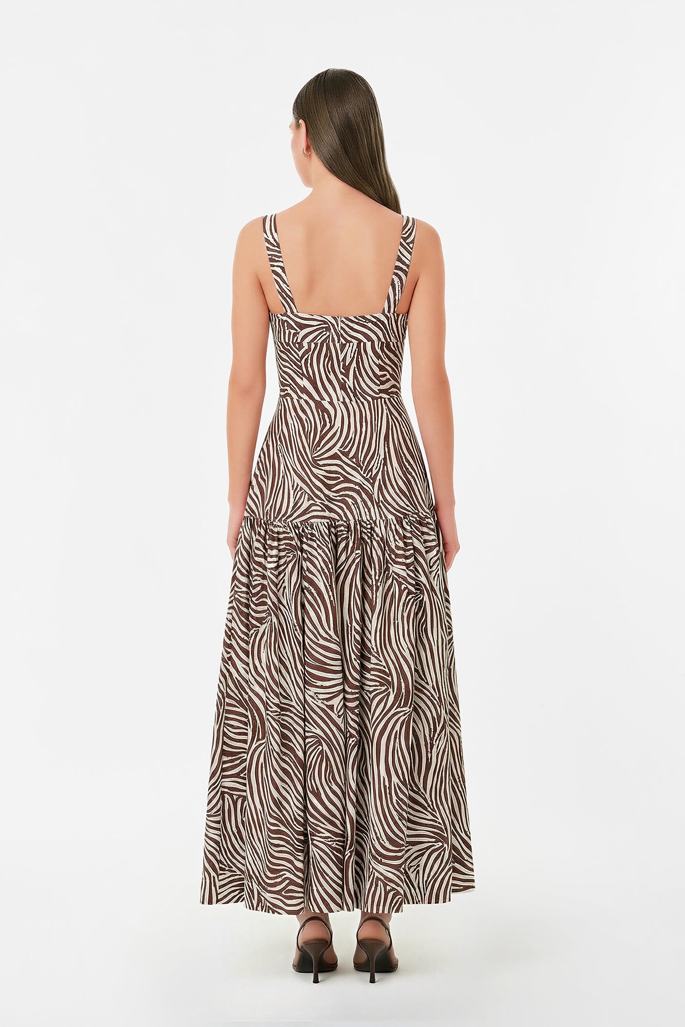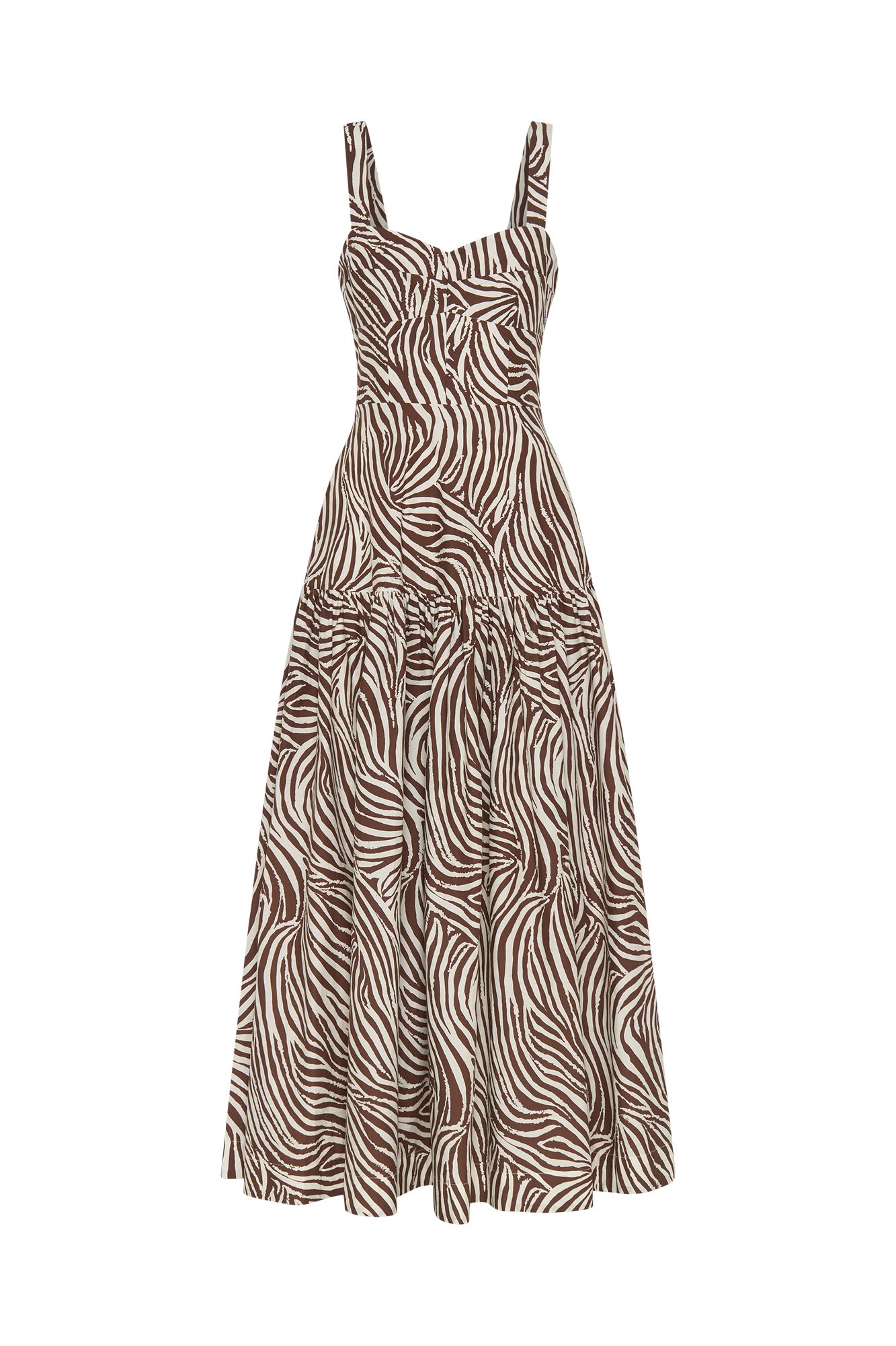 A bold striata print mid-length dress defined by its chocolate and ivory tones. Designed with a flattering sweetheart neckline and wide shoulder straps, it features a fitted bodice that falls into a softly gathered tiered skirt.