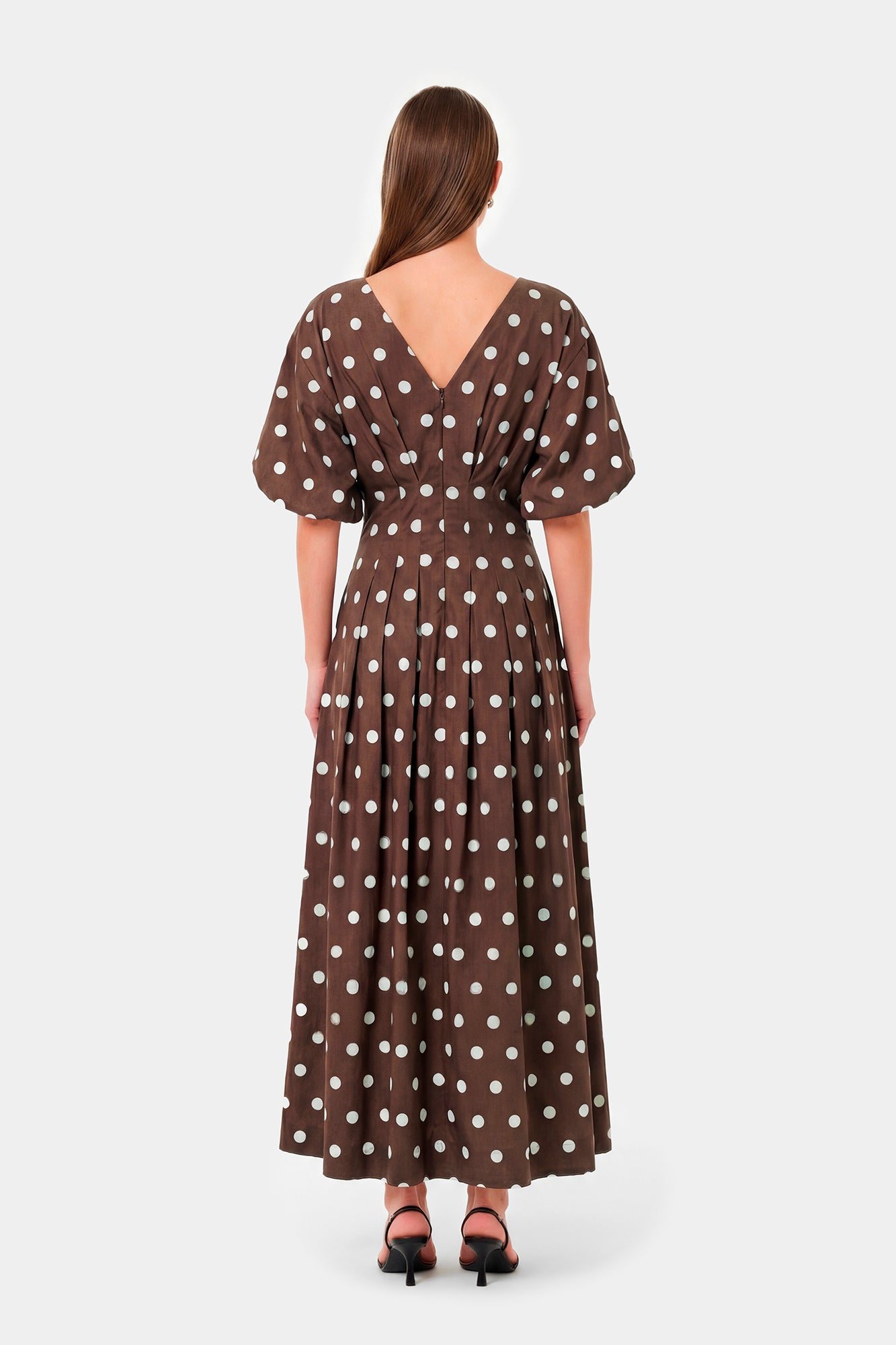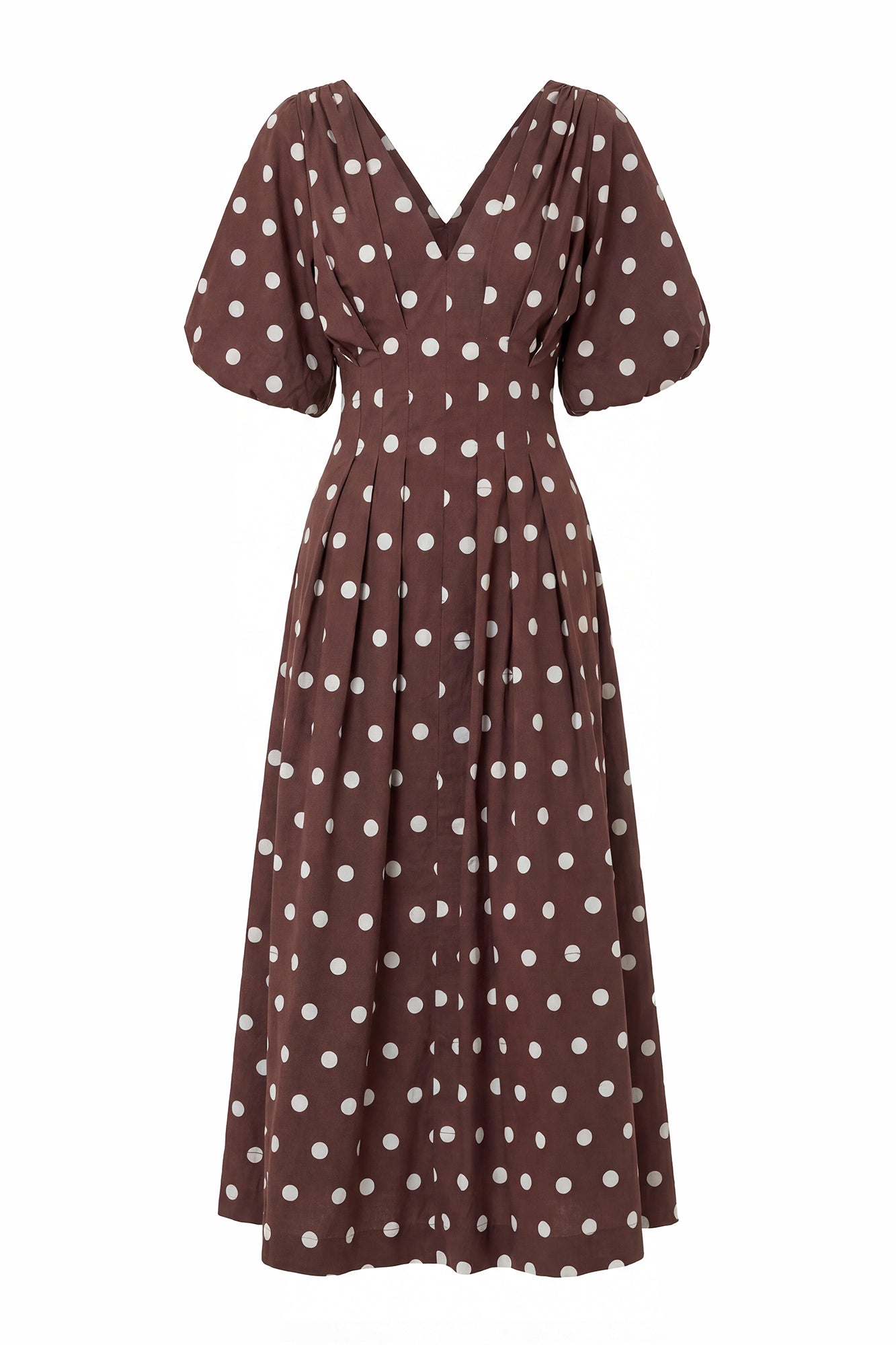 A timeless mocha mid length dress with classic white polka dots. Designed with a flattering V-neckline, soft voluminous sleeves, and a defined waist for an effortless silhouette.