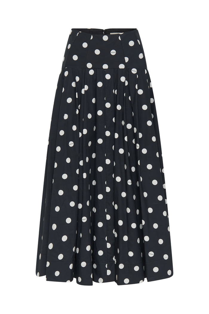 Designed to sit high on the waist, this black midi skirt is detailed with classic white polka dots for a refined yet playful finish. It falls into a softly flared shape that brings fluid movement and modern sophistication to the silhouette. Style with the coordinating cropped top for a polished head-to-toe statement.